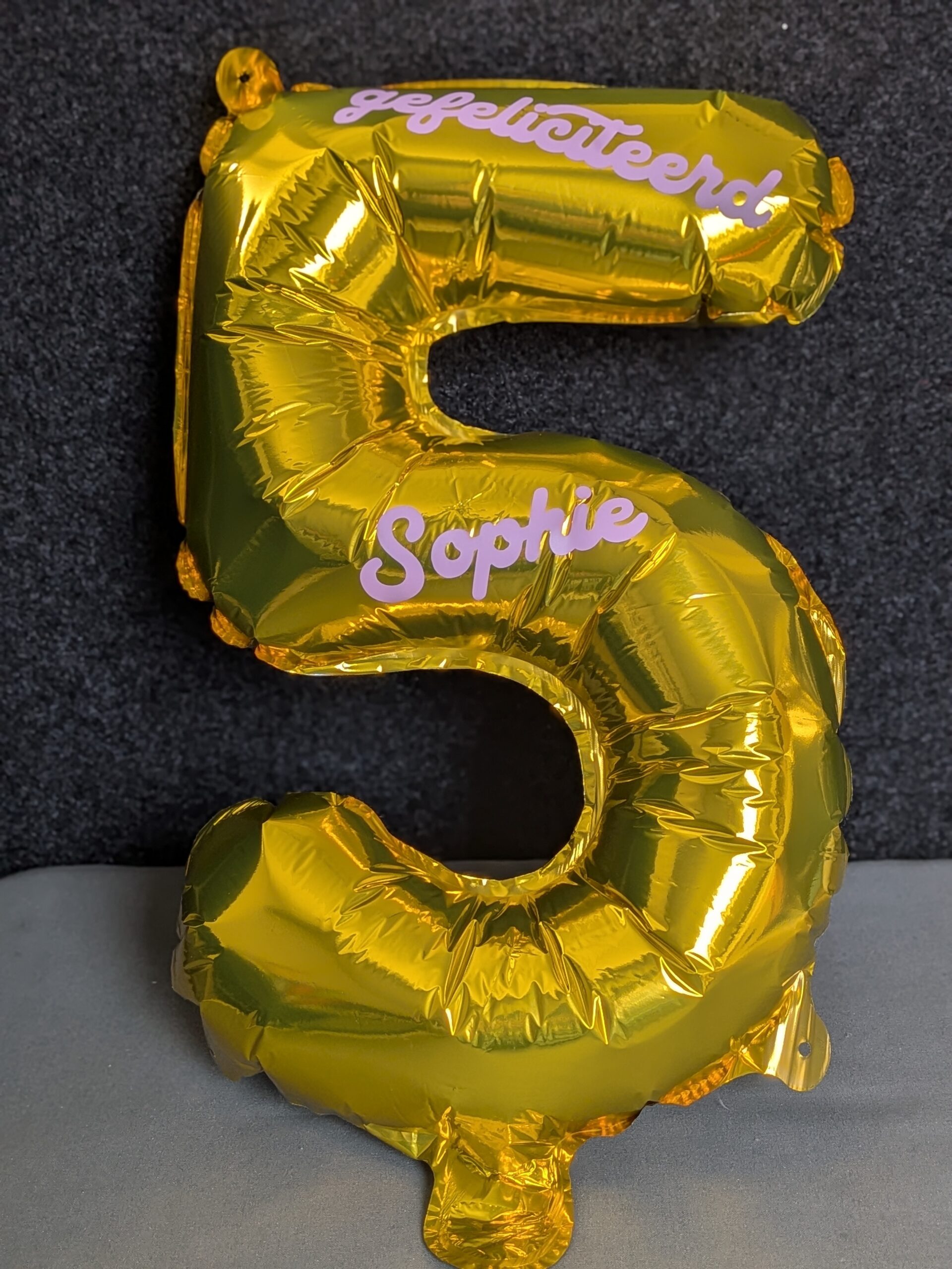 Een leuke folieballon goudkleurig. Verkrijgbaar in verschillende cijfers: 1,2,3,4,5,6,7,8,9,0 Deze kan kosteloos gepersonaliseerd worden met een naam en/of leeftijd of een andere tekst.
